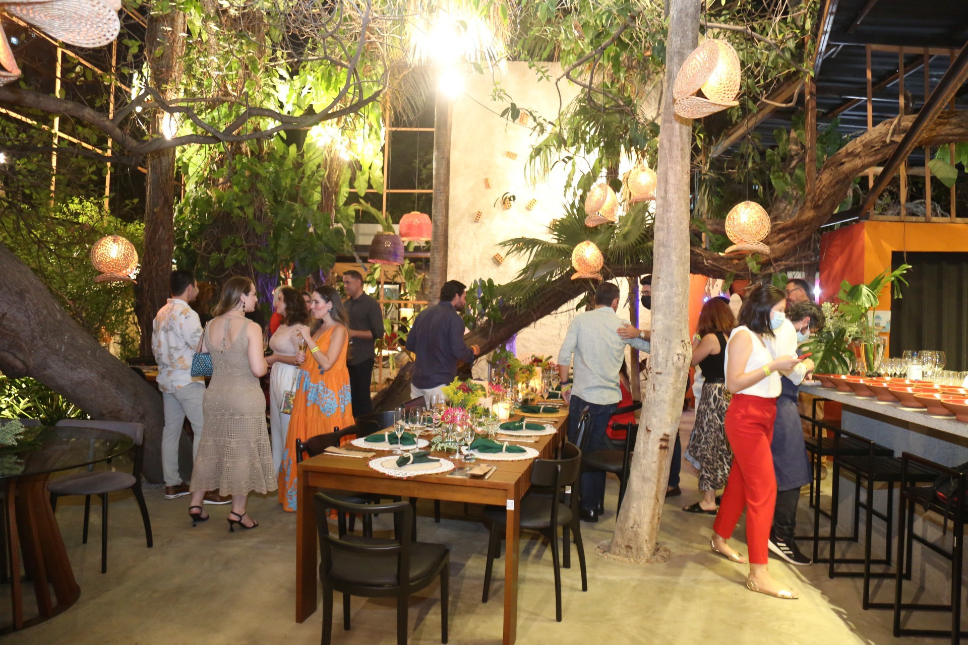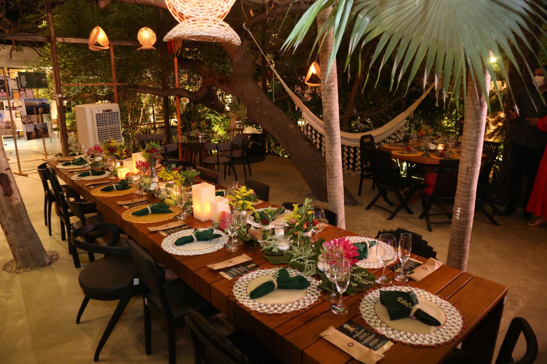 Para garantir a temperatura do ambiente aberto e com muita vegetação, climatizadores da Zap Eventos foram estrategicamente posicionados. As mesas, uma delas com 14 lugares, eram da Rônega& Continuità, assim como as cadeiras, de designers cearenses, itens da curadoria do arquiteto Ney Filho para conceber o espaço "Comedoria".