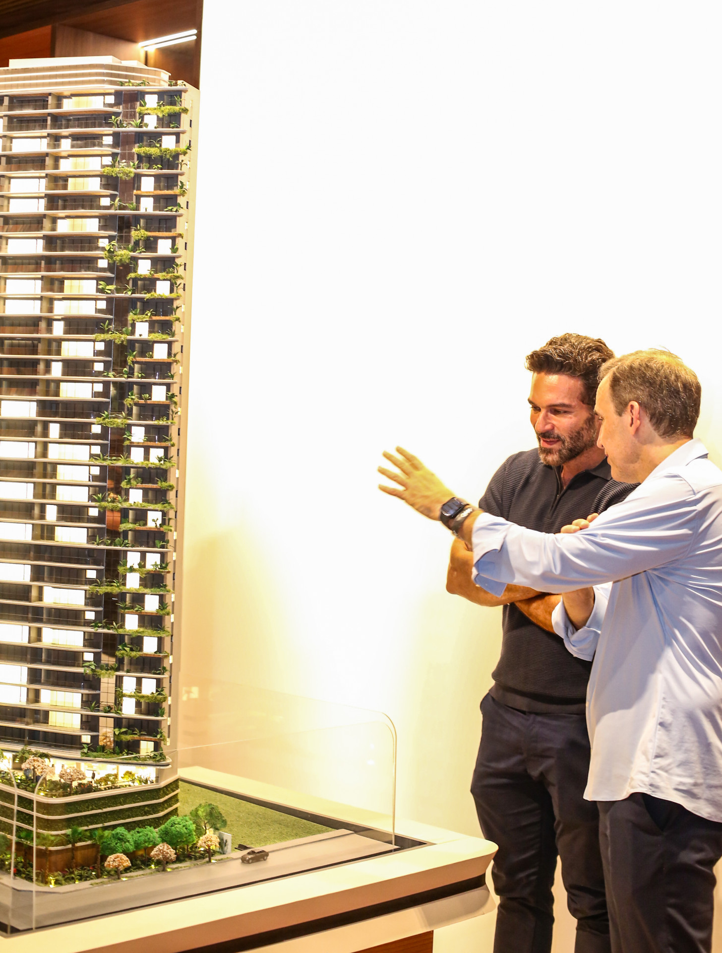 Com todos os apartamentos voltados para o nascente, plantas têm 4 suítes e áreas privativas de 165 m², 200 m² e 205 m². O paisagismo é do escritório Abbud, referência nacional na criação de espaços verdes integrados à cidade, e a ambientação de interiores de Thaisa Bohrer.