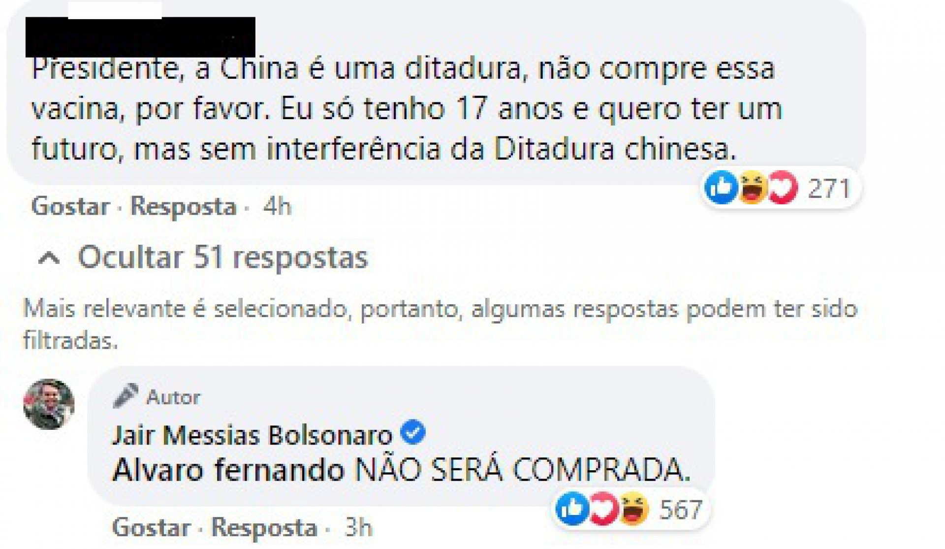 O presidente se manifestou diante de questionamentos de seguidores nas redes sociais. Um deles dizia: "Presidente, a China é uma ditadura, não compre essa vacina, por favor. Eu só tenho 17 anos e quero ter um futuro, mas sem interferência da Ditadura chinesa. Bolsonaro respondeu a ele: "NÃO SERÁ COMPRADA" (caixa alta do presidente).