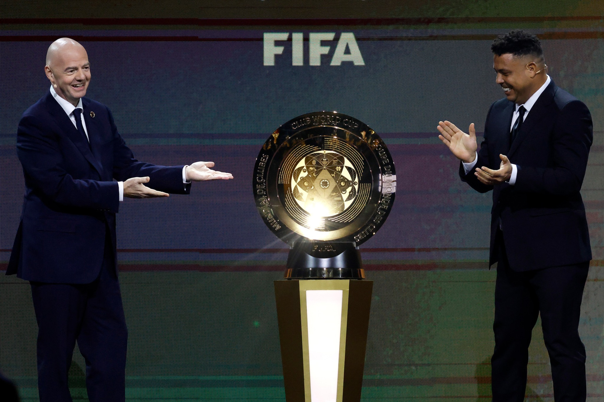 Troféu do 'Super Mundial' apresentado pelo presidente da Fifa, Gianni Infantino, e pelo pentacampeão brasileiro Ronaldo 'Fenômeno'
