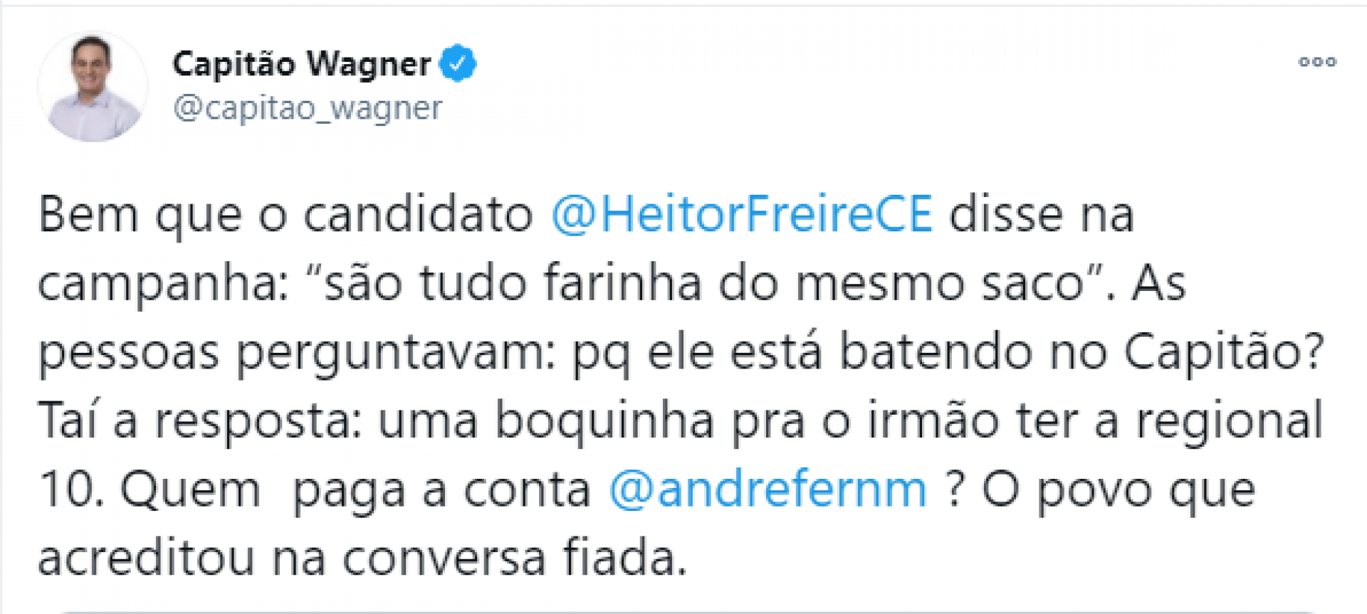 Pelo Twitter, Wagner escreveu: “Bem que o candidato Heitor Freire disse na campanha: ‘são tudo farinha do mesmo saco’. As pessoas perguntavam: por que ele está batendo no Capitão? Taí a resposta: uma boquinha pro irmão ter a Regional 10”.