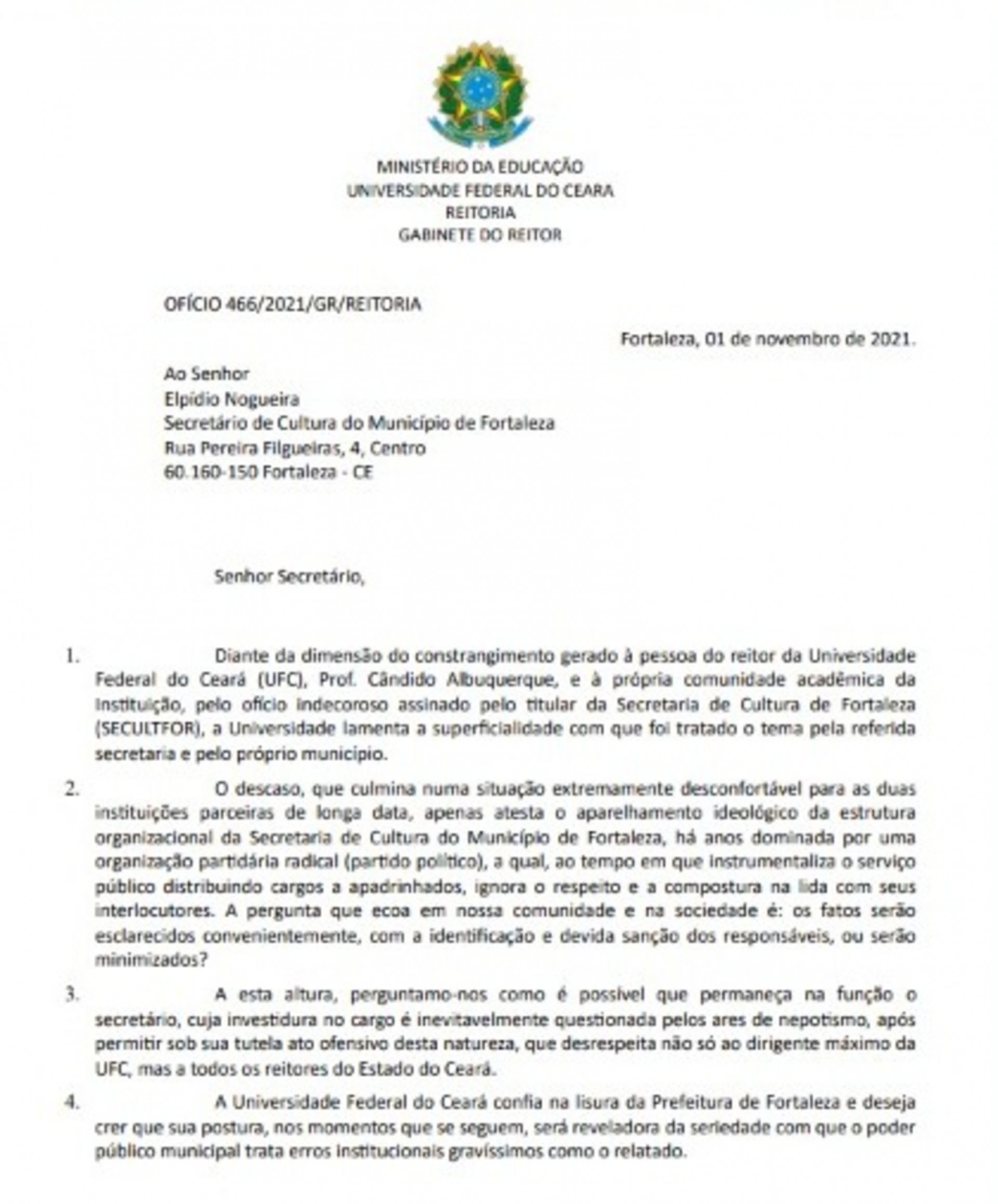 1. Diante da dimensão do constrangimento gerado à pessoa do reitor da Universidade Federal do Ceará (UFC), Prof. Cândido Albuquerque, e à própria comunidade acadêmica da Instituição, pelo ofício indecoroso assinado pelo titular da Secretaria de Cultura de Fortaleza (SECULTFOR), a Universidade lamenta a superficialidade com que foi tratado o tema pela referida secretaria e pelo próprio município.