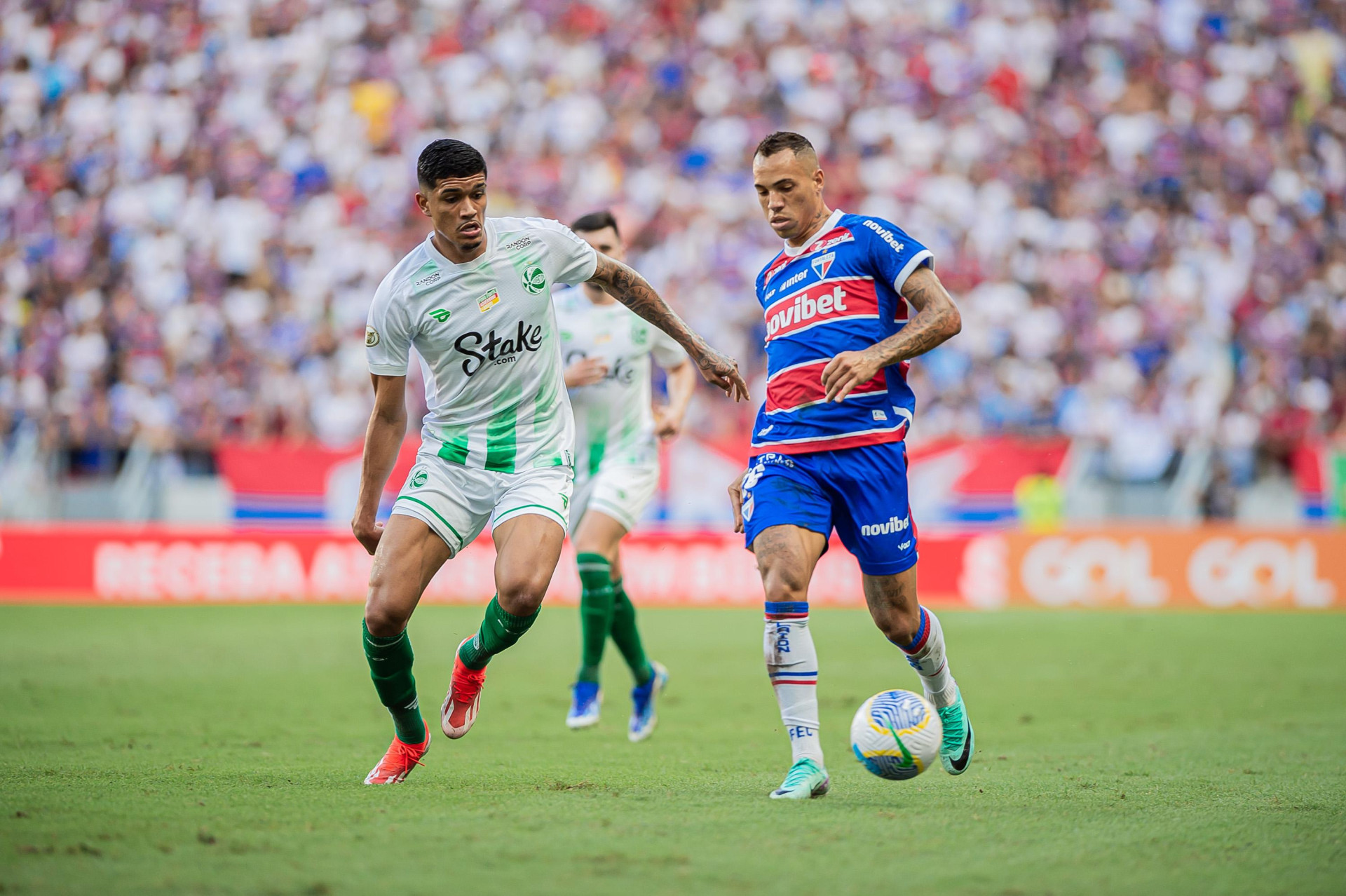 Breno Lopes disputa lance no jogo Fortaleza x Juventude, no Castelão, pela Série A 2024