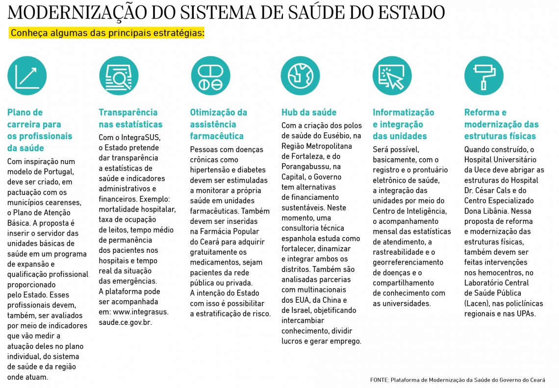Na prática, essa modernização passa, por exemplo, por interligar as redes federal, estadual e municipal; instituir prontuários eletrônicos em todas as unidades de saúde, garantindo acesso ao histórico dos pacientes; concluir a regionalização dos hospitais de alta complexidade, com a entrega do último no Vale do Jaguaribe; criar agências regionais nas macrorregiões (Fortaleza, Sobral, Sertão Central, Litoral Leste/Jaguaribe e Cariri); avaliar constantemente o desempenho dos profissionais e das estruturas de saúde estaduais; disponibilizar estatísticas mensais sobre gastos e prioridades do Governo e otimizar a assistência farmacêutica.