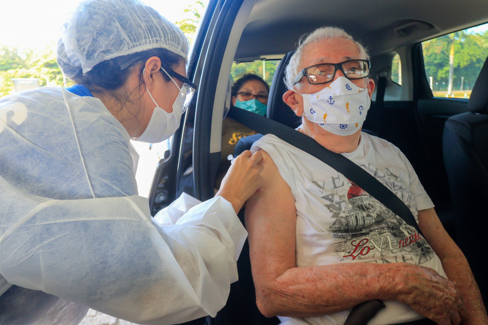 Idosos acima de 90 anos receberam prioridade no agendamento. Segundo a secretária, a previsão é de que, até domingo, os idosos acima de 80 anos que escolheram a modalidade drive-thru sejam vacinados.