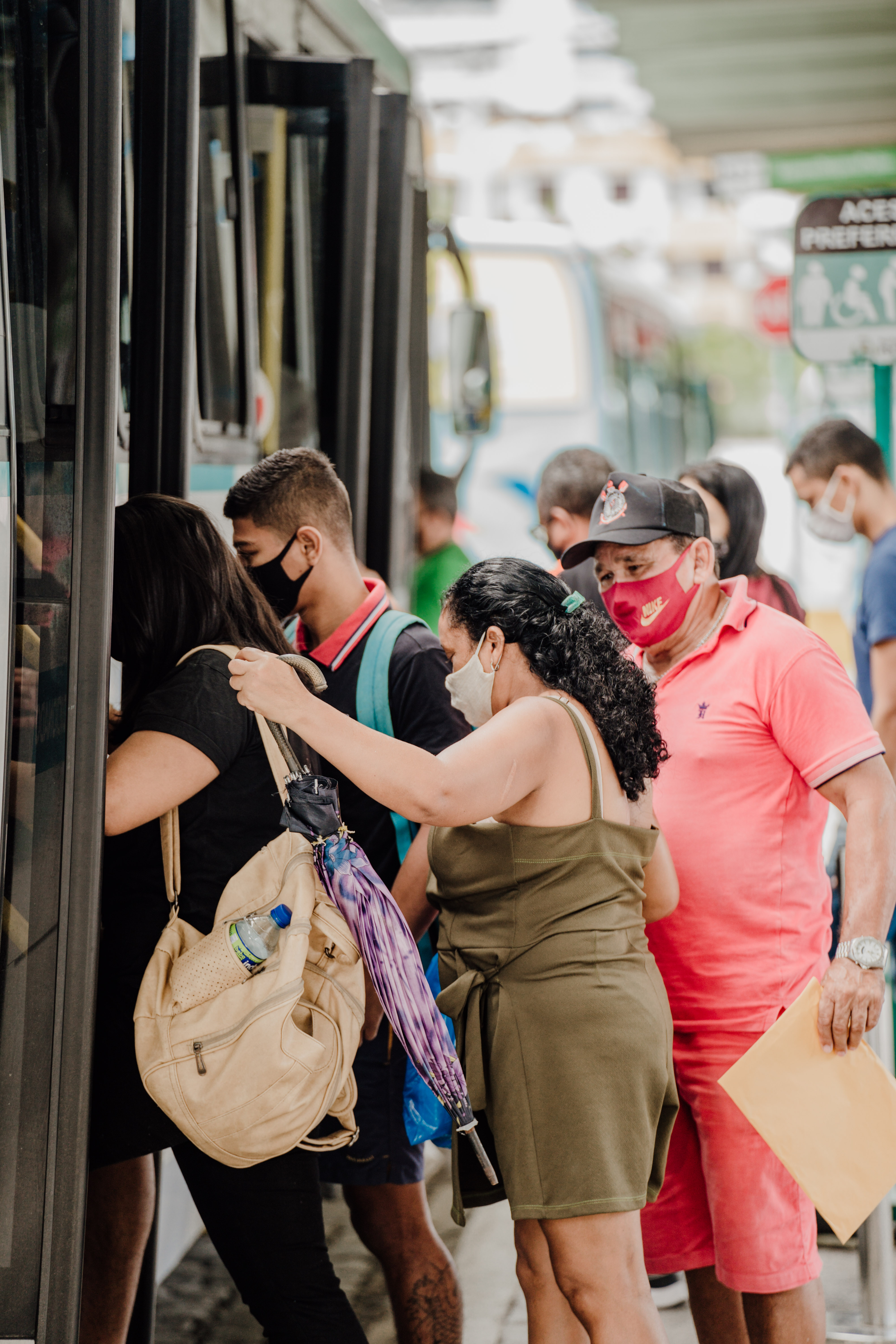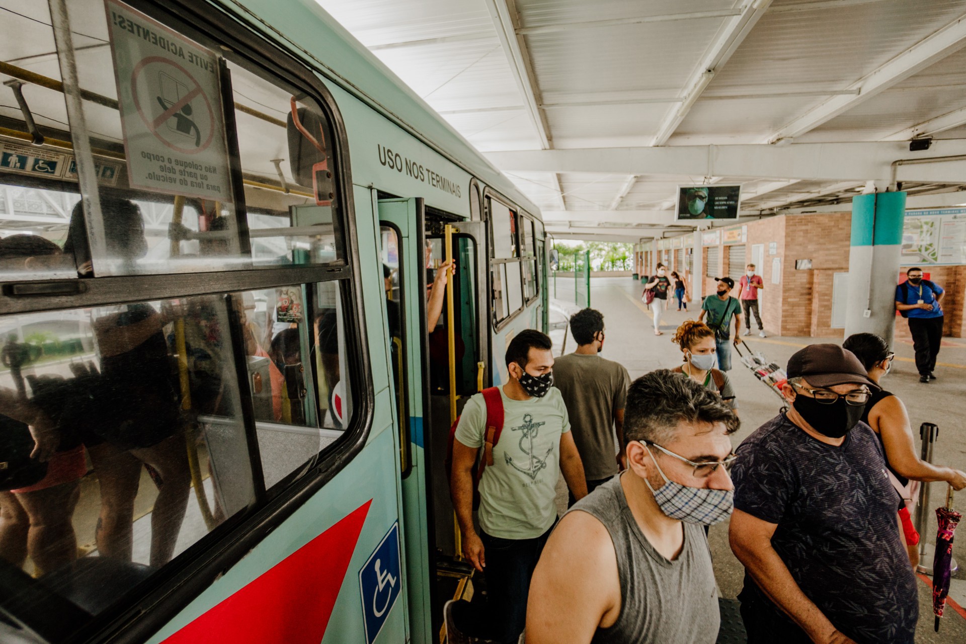 Lurdiana Morais, 19, descia do coletivo vindo do bairro Alameda das Palmeiras cheio de passageiros. Para a jovem, a realidade é diferente do que é recomendada pelos médicos. "É para estarmos distantes um do outro. Nem sempre eu consigo vir sentada. Nem sempre os ônibus são higienizados", lamenta. Questionada se tem medo de ser infectada pelo vírus, a passageira afirma que não. "Tudo é permissão de Deus".