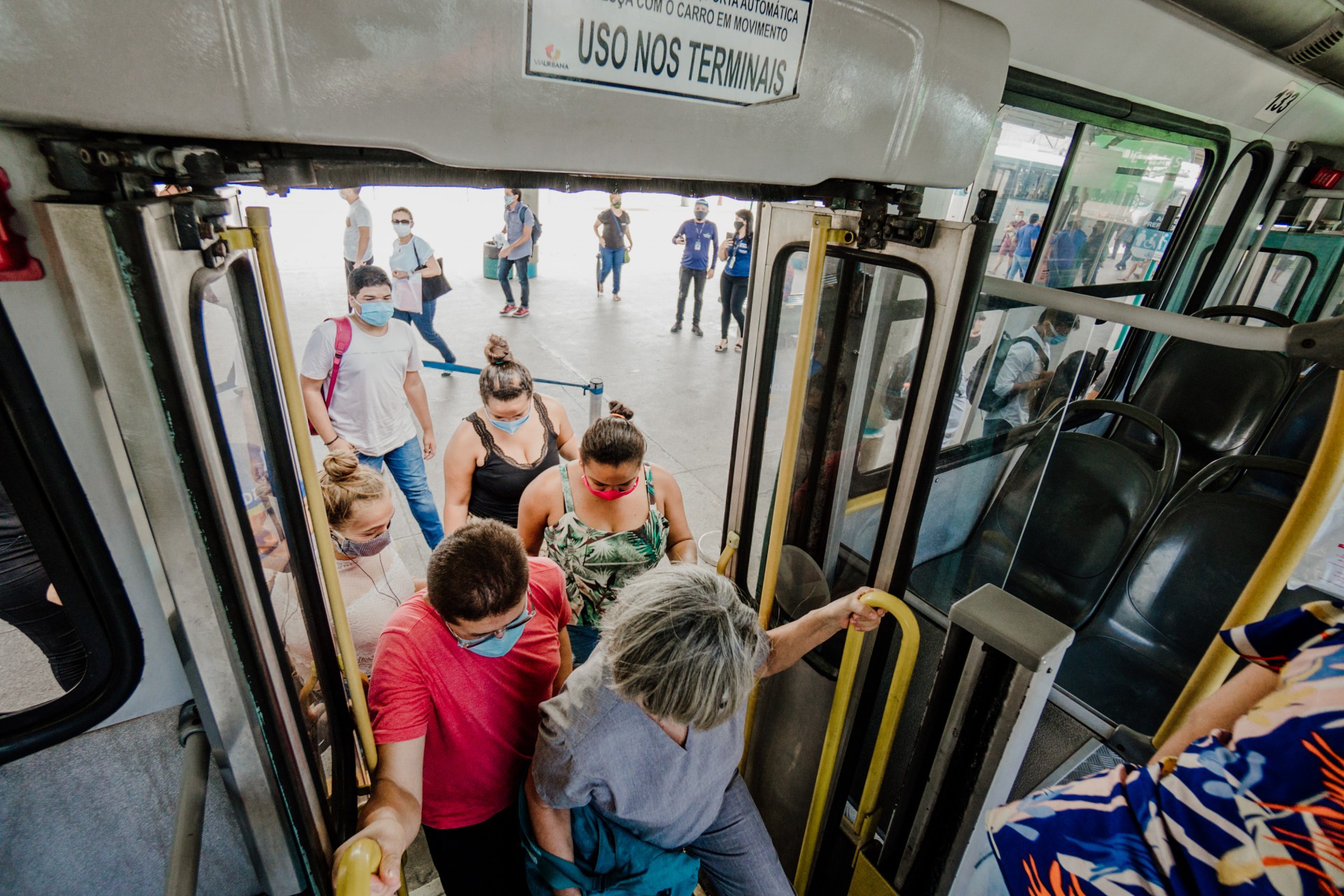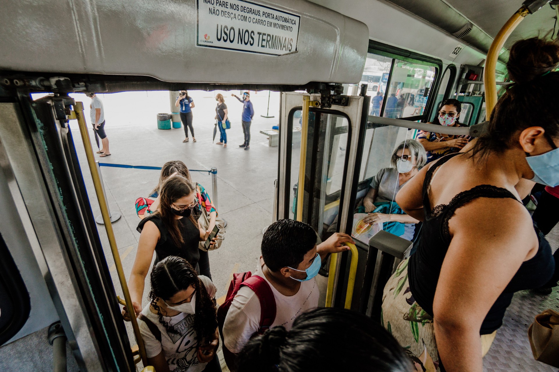 Todos os dias, Viviane pega seis ônibus. Do Jangurussu ao Papicu, a jovem afirma que muitas vezes prefere ir de pé e se isolar para evitar ao máximo o contato com outros usuários. "Por descuido da população, as pessoas baixam a máscara. É um contato muito grande, querendo ou não. Na plataforma, não ficamos tão em cima uns dos outros, mas também não tem esse distanciamento todo”.