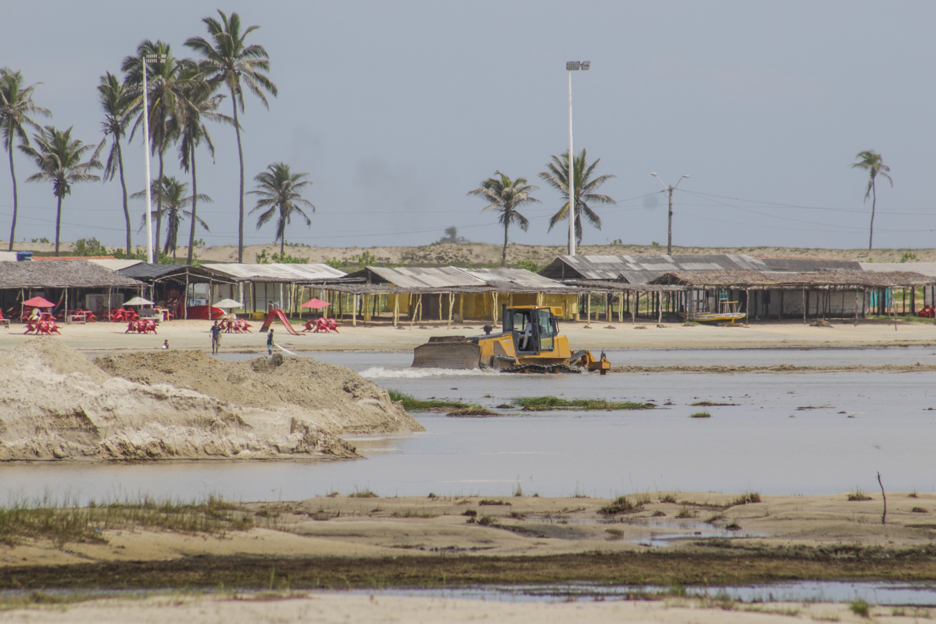 A profundidade já chegou a ser de cinco metros em alguns pontos, mas hoje a lagoa do Cauípe, em Caucaia, na Região Metropolitana de Fortaleza, está num raso desolador. Dá para se caminhar por onde era o meio do espelho d'água. O rio que leva o mesmo nome e alimenta o manancial está com o leito desviado e a parede da lagoa, próxima ao mar, foi aberta. Por isso o esvaziamento repentino. Em vez de banhistas e kitesurfistas costumeiros do local, o vaivém na manhã desta quinta-feira, 24, era de caçambas (pelo menos oito), recarregadas em sequência, a cada três minutos, por uma pá escavadeira. Bem próximo, um trator remexia o fundo do rio e de um trecho da lagoa com resto de água. Desde dezembro, a terra extraída é despejada sobre a vegetação de restinga a sudeste, já encobrindo uma área bastante extensa. A paisagem natural está desfigurada. "Está sendo de domingo a domingo. A gente tá jogando (a areia) onde eles mandam, até lá embaixo", disse um dos caminhoneiros, apontando para a frente, onde outras caçambas circulavam em fila.