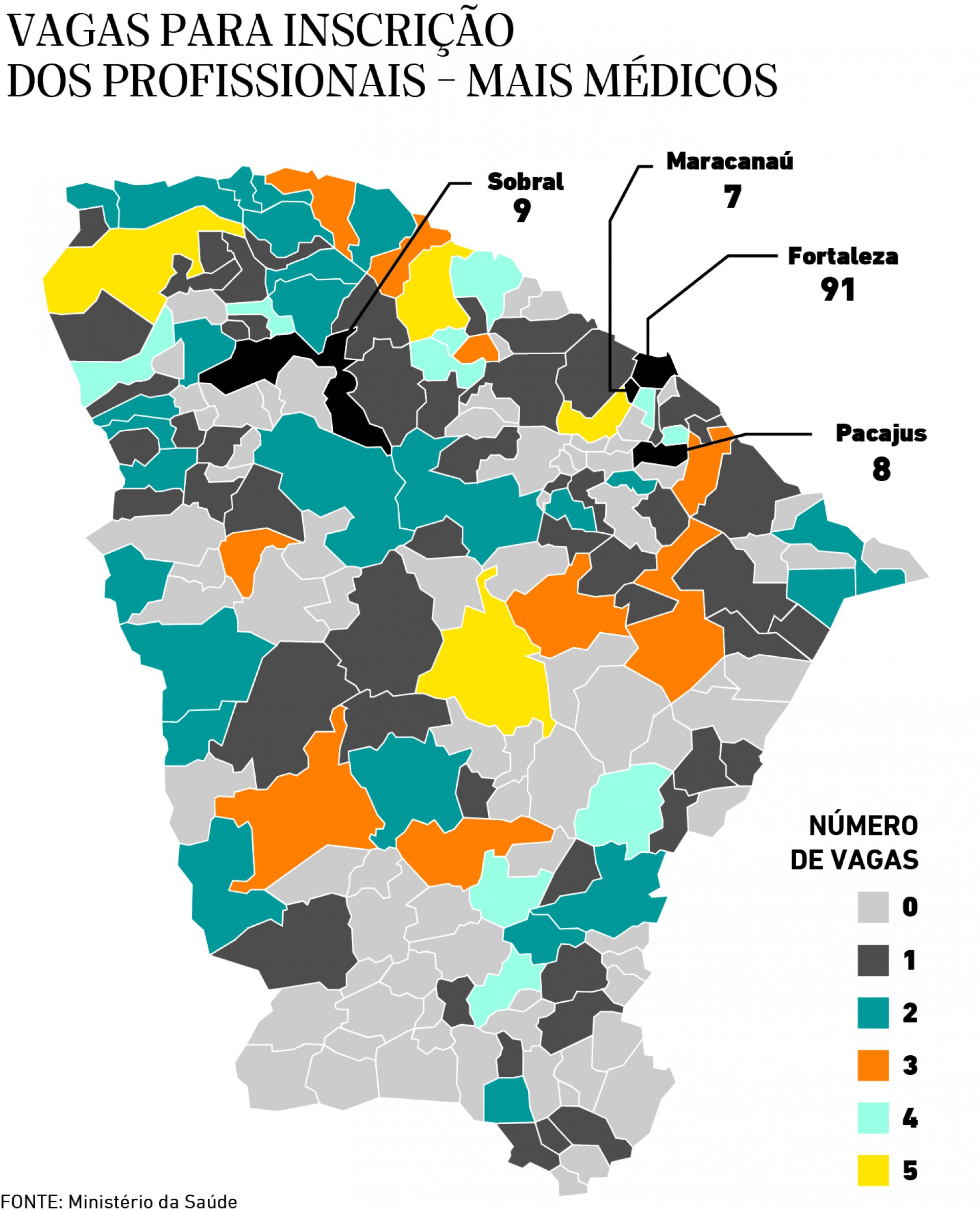 O Ceará é o estado do Nordeste com o maior número de vagas, seguido da Bahia (278) e do Maranhão (246). No total, serão 5,9 mil vagas distribuídas para as cinco regiões do País. O objetivo do programa é garantir atendimento médico nas áreas onde há maior vazio assistencial dos serviços de atenção primária, porta de entrada do Sistema Único de Saúde (SUS).