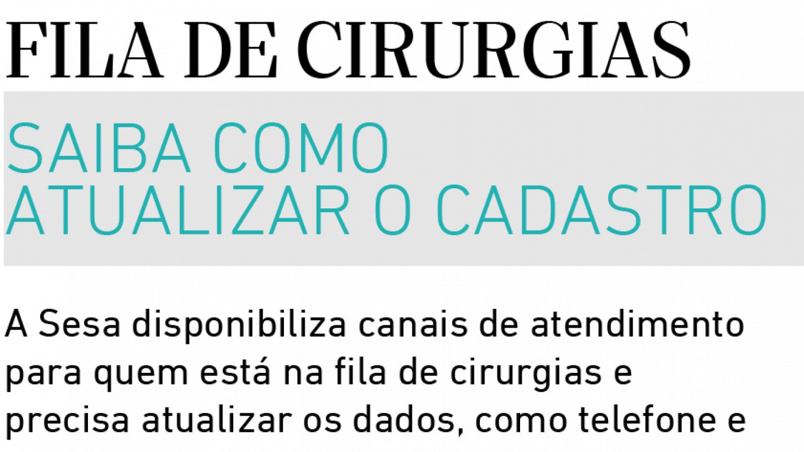 A Sesa disponibiliza canais de atendimento para quem está na fila de cirurgias e precisa atualizar os dados, como telefone e endereço. Os atendentes estão disponíveis nos contatos divulgados das 7 às 18 horas, de segunda a sexta-feira.