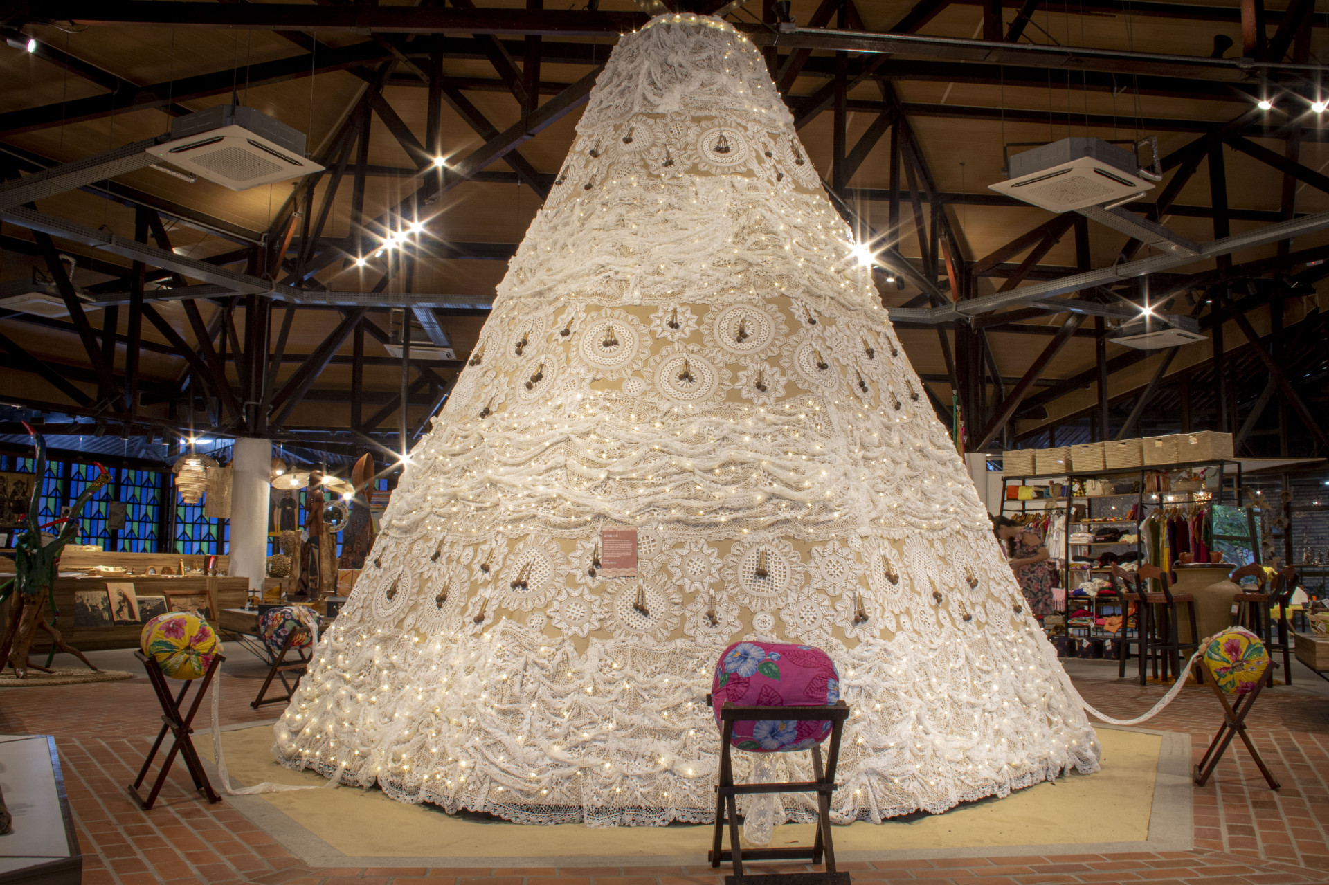 A árvore de Natal da Central de Artesanato do Ceará (CeArt), em Fortaleza, realizou uma homenagem às rendeiras do Ceará neste ano. Instalada na loja da galeria Mestre Noza, na Praça Luíza Távora, o símbolo natalino ganha destaque pelo revestimento em renda de bilro. A árvore foi produzida pelas rendeiras do Centro de Rendeiras da Prainha e elaborada pelo designer da CeArt, Patrício Barros.