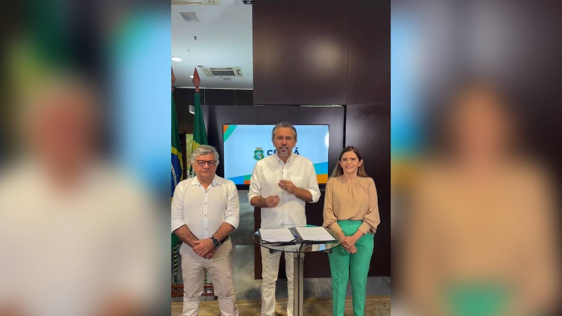 Da esquerda para a direita: secretário de Planejamento e Gestão, Alexandre Cialdini; governador Elmano de Freitas; e secretária da Educação, Eliana Estrela, durante anúncio na live, nesta quinta-feira, 24