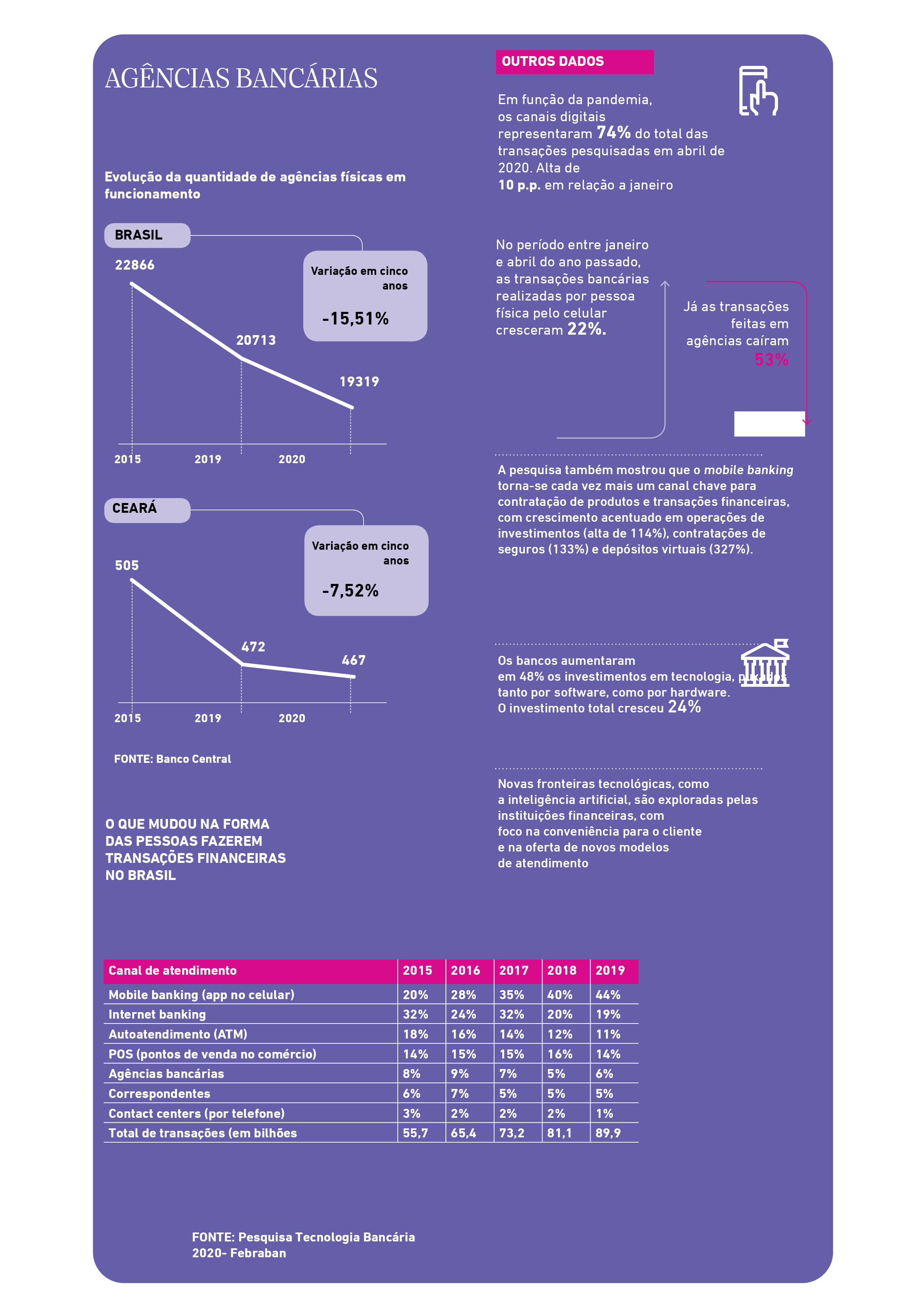 Dados do Banco Central mostram que, até dezembro, a rede bancária brasileira contava com 19.319 agências em funcionamento. São 1,3 mil unidades a menos do que em dezembro de 2019 e uma rede 15,51% mais enxuta que em igual mês de 2015. No Ceará, o número de agências físicas encolheu 7,2% no período, fazendo com que, em dezembro de 2020, fosse contabilizada uma rede com 467 agências físicas ativas.