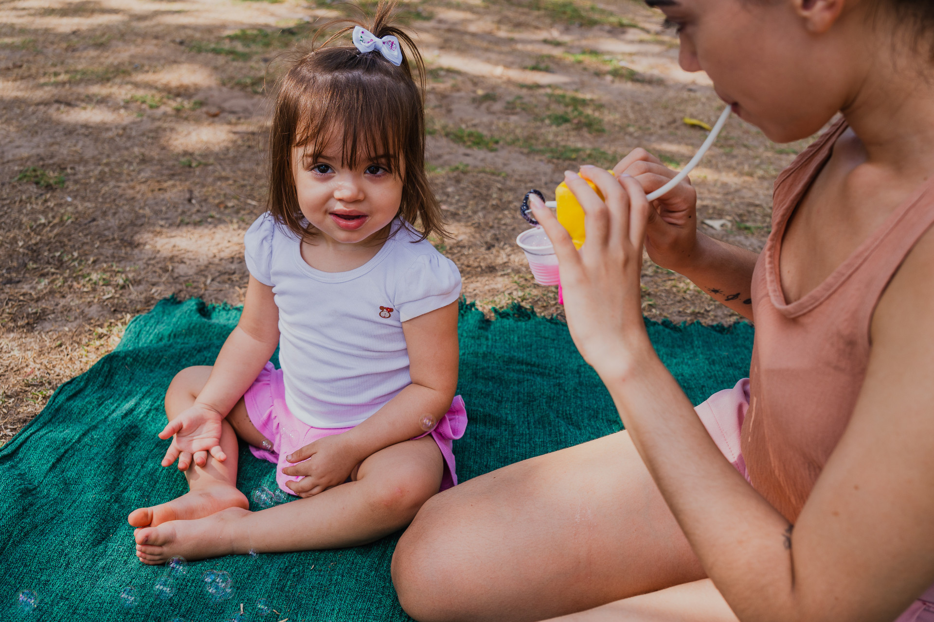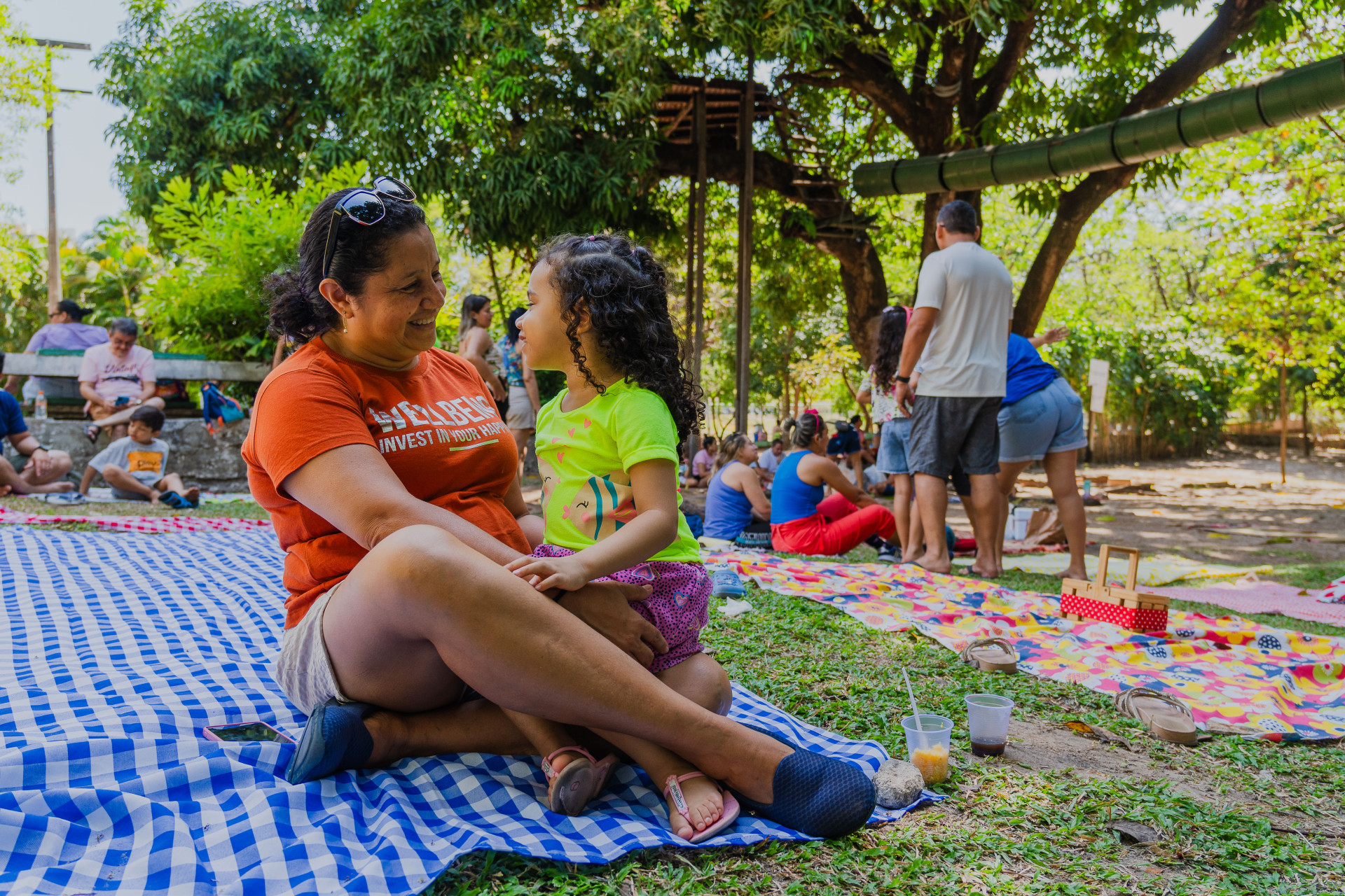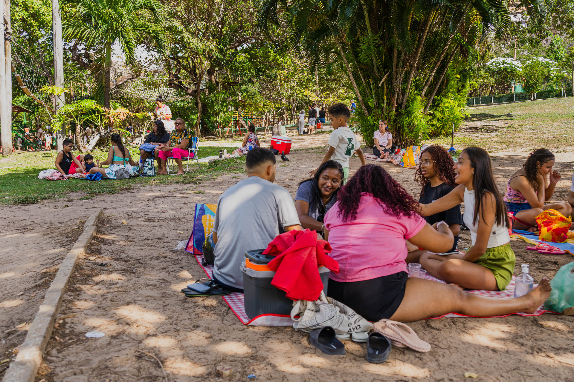 Sob as sombras das árvores, diversas famílias faziam piqueniques. Os grupos variavam de tamanho, indo de casais sozinhos a reuniões com uma dúzia de pessoas ou mais. Ao redor, crianças se divertiam nos brinquedos ou pelo gramado.