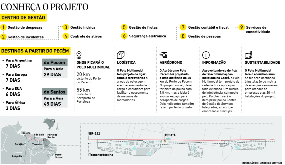 Foram três anos projetando o polo multimodal, envolvendo universidades italiana e marroquina, além da Universidade Federal do Ceará (UFC), onde é promovida uma pesquisa em inovação. O Polo Multimodal do Pecém é considerado uma smart chain city (cidade de cadeia inteligente), modelo que forma um ecossistema pensado a utilizar energia sustentável e tecnologia nos processos.