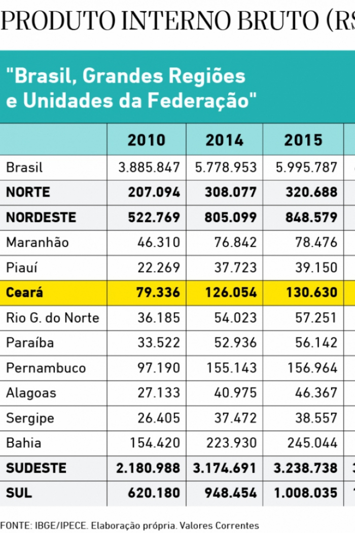 Os dados são do estudo PIB do Ceará nas Óticas da Produção e da Renda/2017, publicado pela Diretoria de Estudos Econômicos (Diec) do Instituto de Pesquisa e Estratégia Econômica (Ipece). Nesse contexto, o Estado figura na 12ª posição do País e a terceira do Nordeste.
