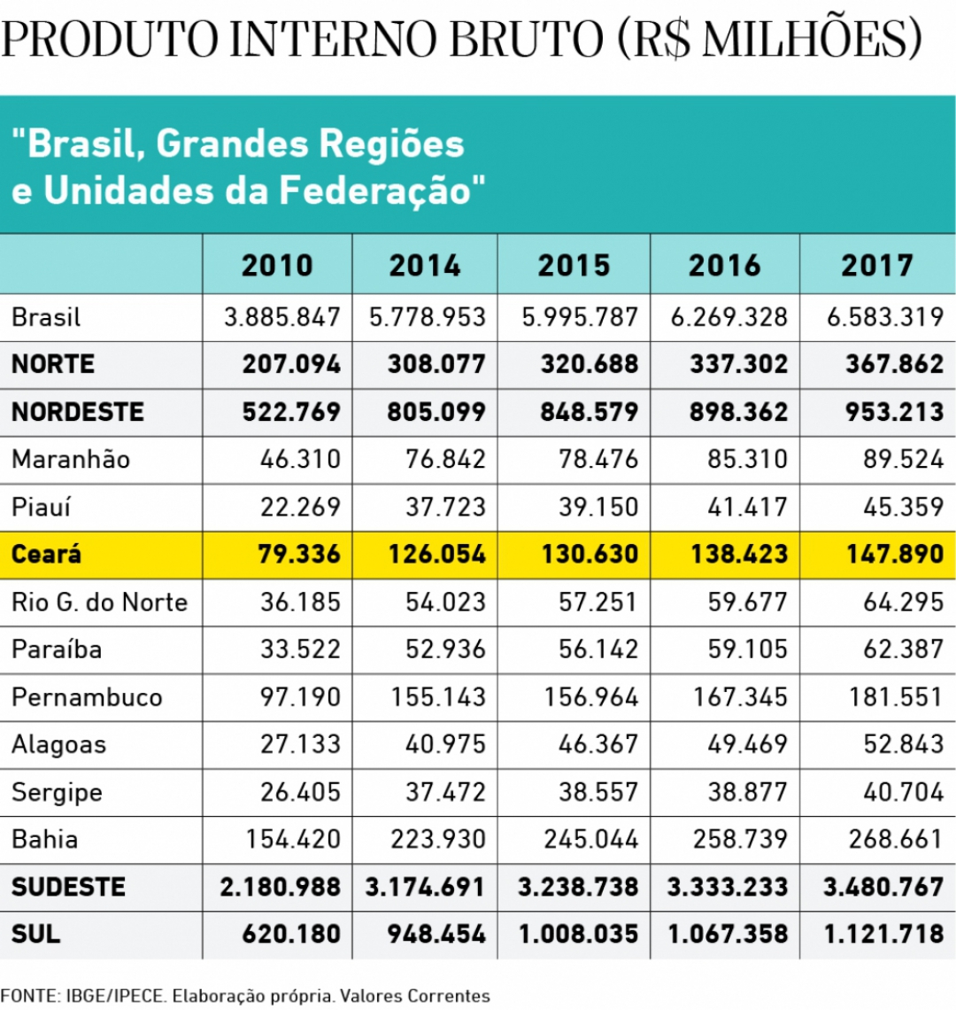 Com boas taxas de crescimento em meio à crise e puxado pelo setor de serviços, o Produto Interno Bruto do Ceará (PIB) subiu para 2,25% em 2017. Um total de R$ 147,8 bilhões que fizeram da participação cearense ser a maior no indicador nacional desde a série histórica iniciada em 2002 (em 1,93%).