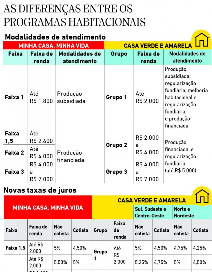 Segundo o Governo Federal, a principal diferença entre os dois programas é que o MCMV atuava somente com produção habitacional, algo que, no novo modelo, há a regularização fundiária, melhoria e produção habitacional financiada. Há previsão de aporte de R$ 2,4 bilhões do Orçamento Geral da União (OGU) para o programa no próximo ano.