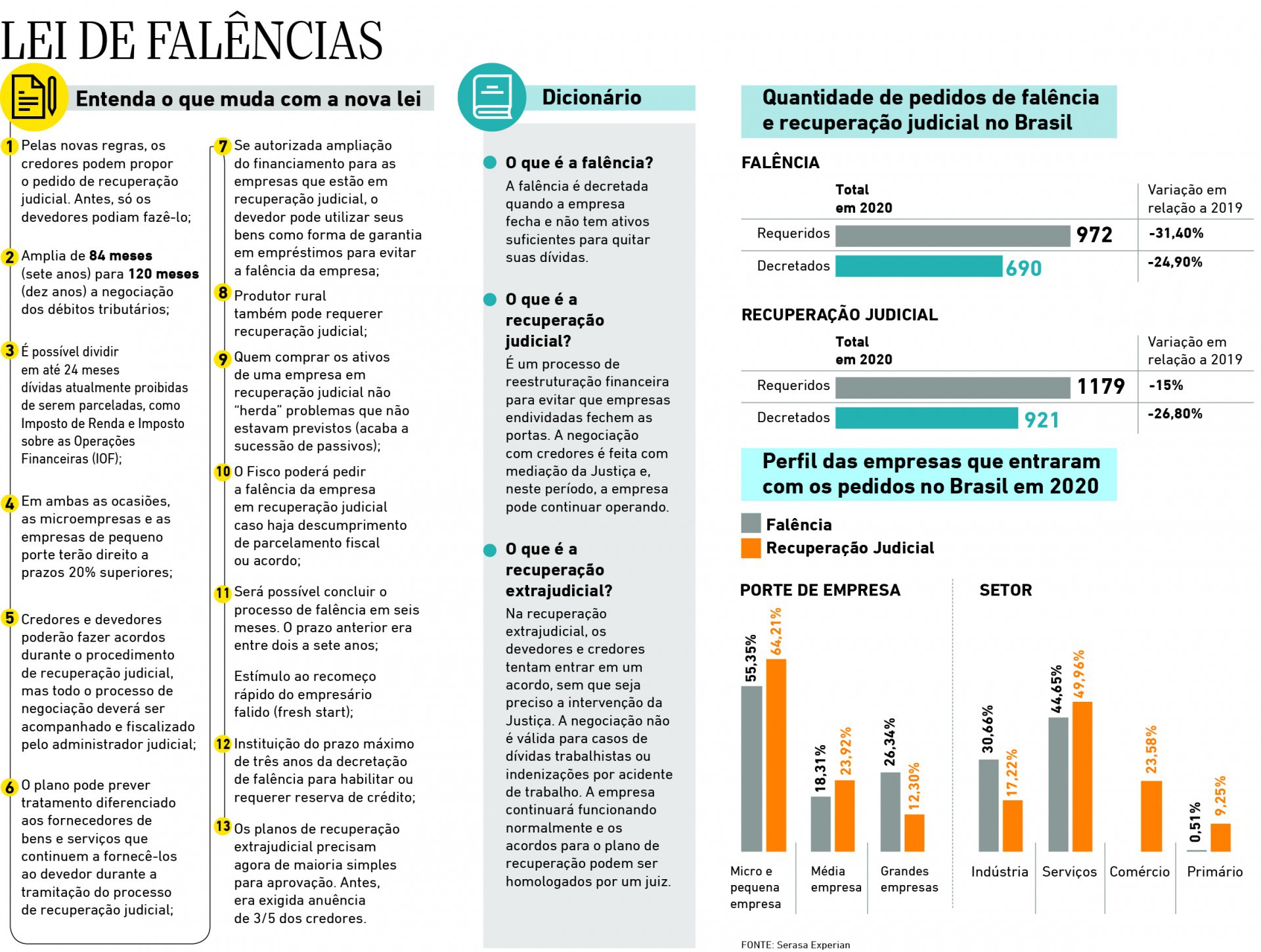 De acordo com dados do Serasa Experian, no ano passado, 972 empresas formalizaram pedidos de falência no Brasil. Outras 1.179 com pedido de recuperação judicial. Os números, apesar de todo o impacto que a pandemia teve sobre a economia, são menores do que os de anos anteriores. Em relação a 2019, por exemplo, houve queda de 31,4% e 15% respectivamente.