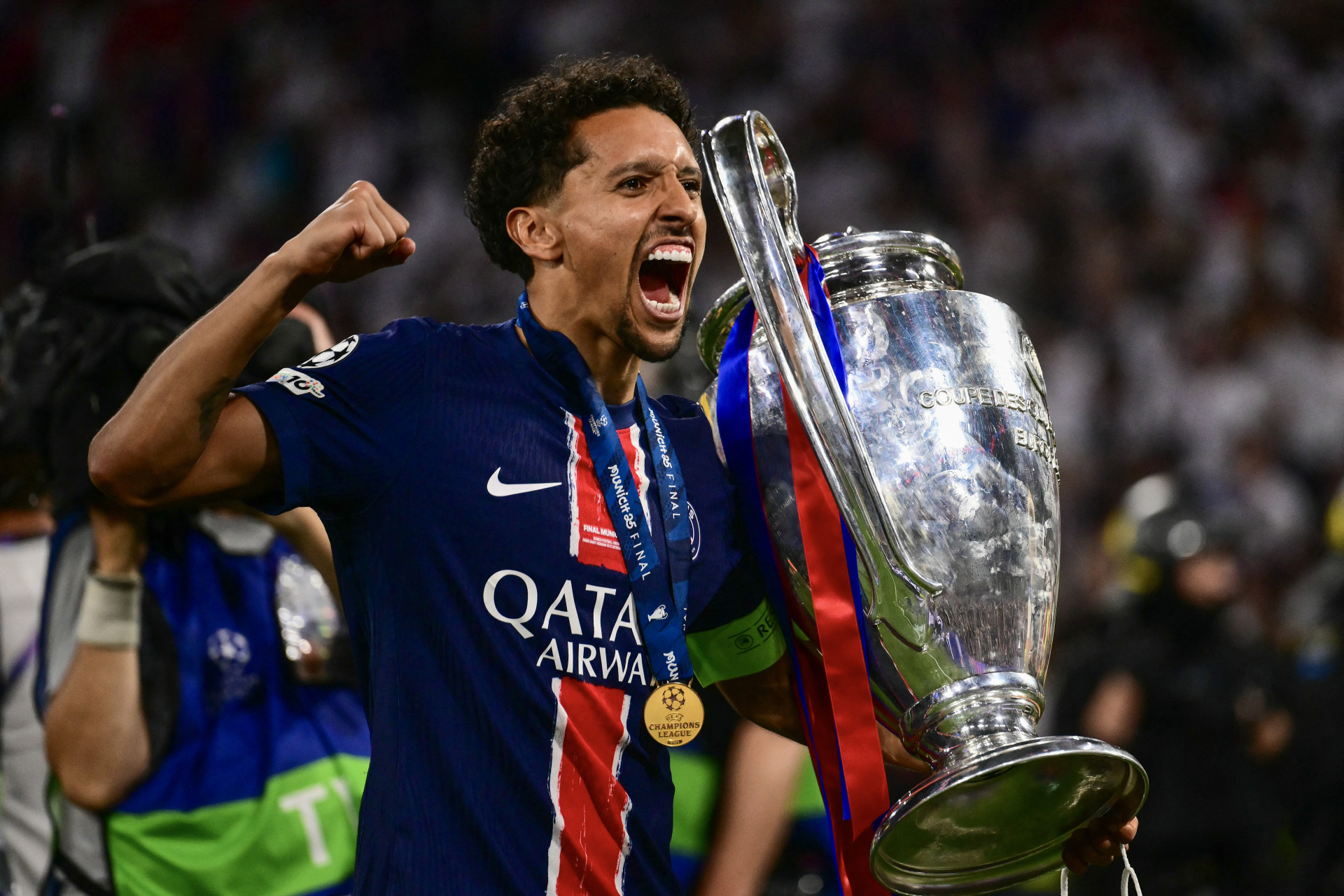 A "Orelhuda", colocada em campo quase duas horas antes pelos argentinos Javier Zanetti e Javier Pastore, foi erguida pelo brasileiro Marquinhos, que entra para a história do PSG como o primeiro capitão a fazer o gesto na conquista do maior título da história do clube francês. (AFP)