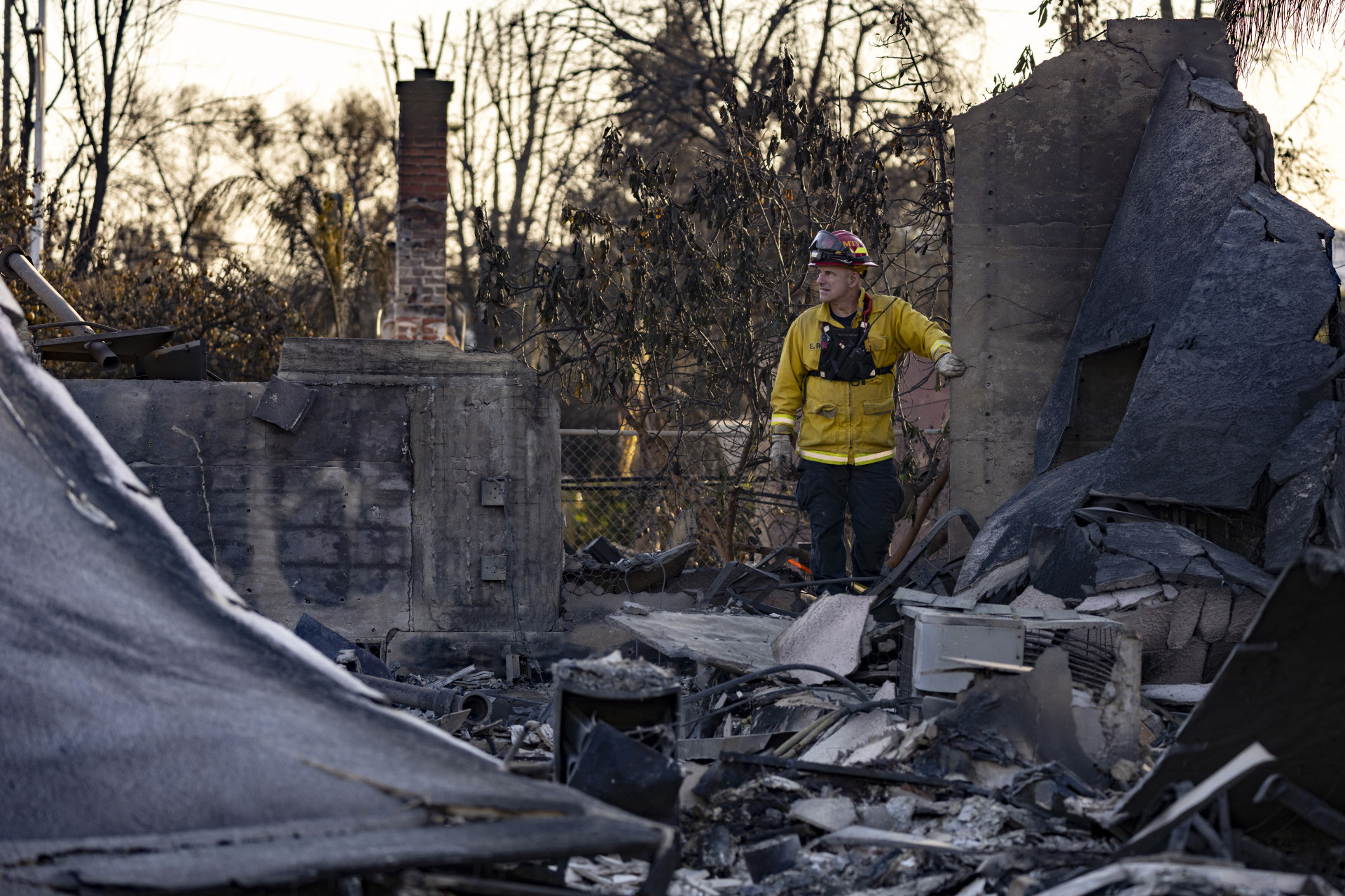 Um bombeiro reage enquanto caminha entre os restos de uma casa reduzida a escombros pelo incêndio Eaton durante operações de busca e salvamento em Altadena, Califórnia, em 13 de janeiro de 2025. Equipes de busca procurando por pessoas mortas em incêndios devastadores em Los Angeles se deslocaram de casa em casa, enquanto os bombeiros se preparavam para ventos com força de furacão que poderiam desencadear novos surtos. Com o desastre na segunda maior cidade dos Estados Unidos em seu sétimo dia, sabe-se que 24 pessoas morreram, com o número de mortos devendo aumentar, e mais de 90.000 pessoas ainda estão desabrigadas.