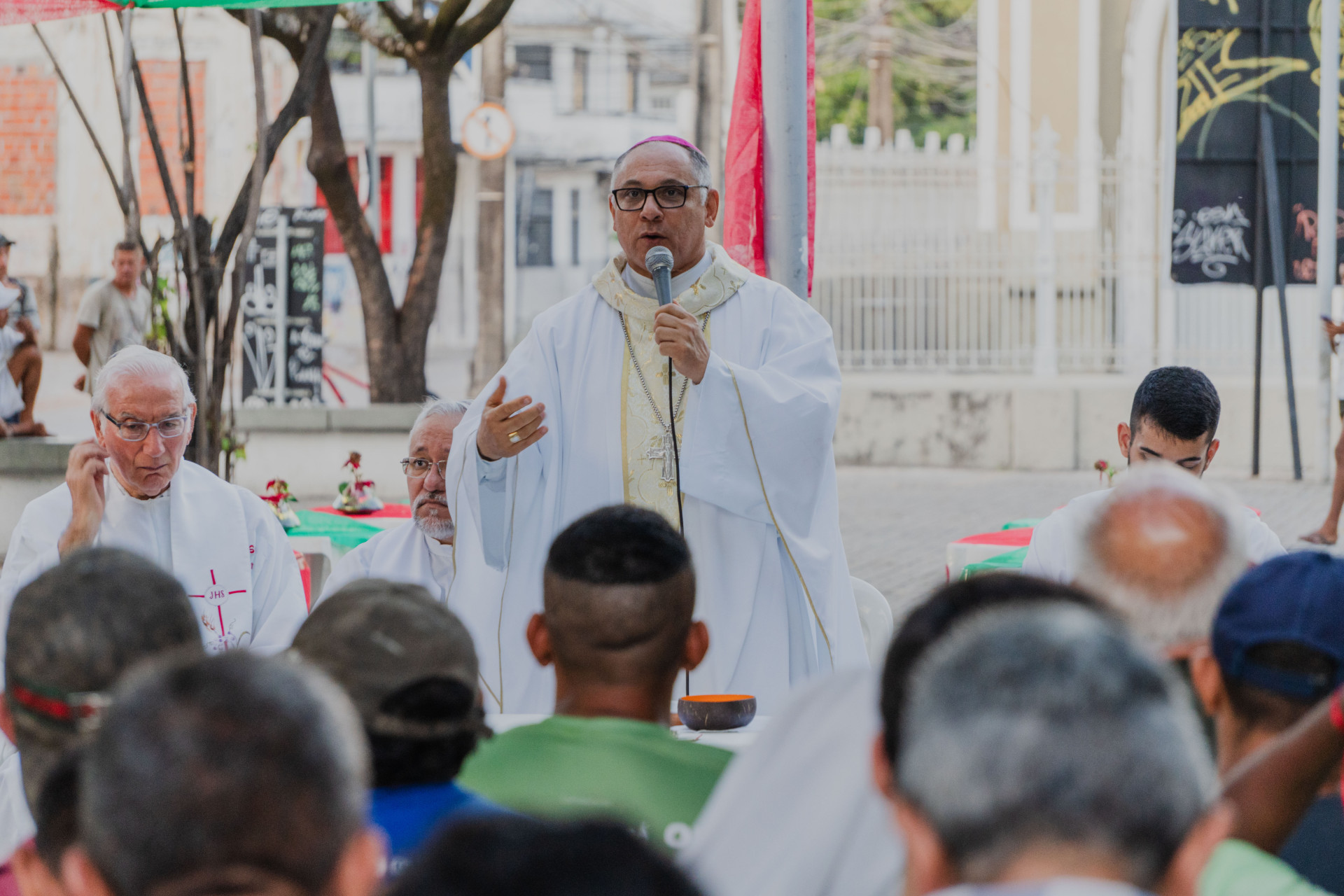 O arcebispo de Fortaleza, dom Gregório Paixão, presidiu na tarde desta quinta-feira, 25, a missa de Natal para a população em situação de rua da Casa do Povo da Rua, no Centro da Cidade. Fiéis de diversas localidades se uniram à celebração na praça Figueiras de Melo.