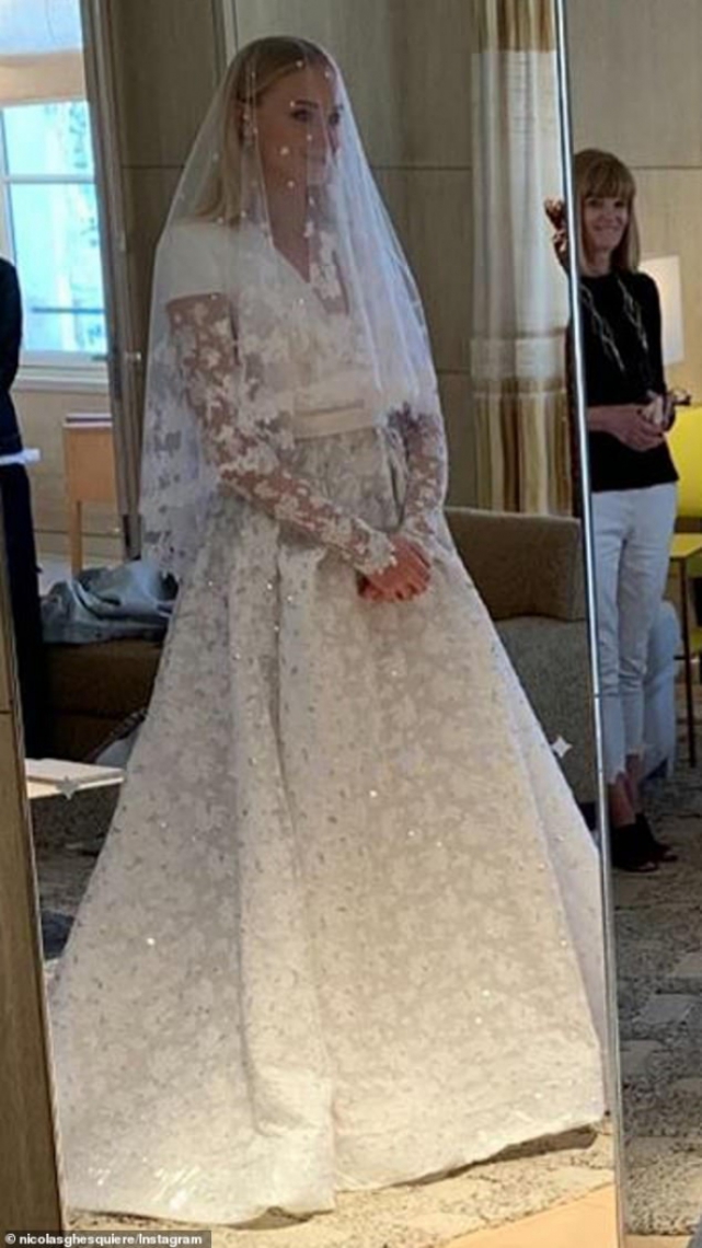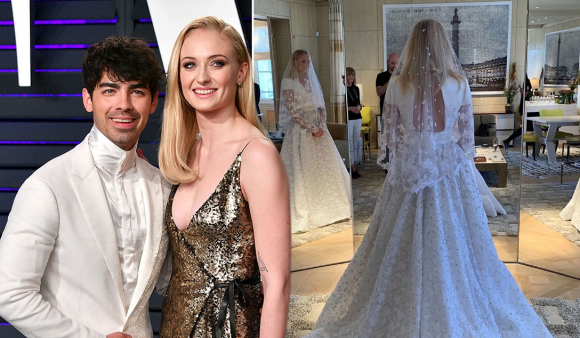 Sophie estava belíssima, trajando um Louis Vuitton assinado por Nicholas Ghesquière. O vestido, feito de tule bordado com flores e gazar de seda, demorou mais de 350 horas para ser confecionado. Mais de dez bordadeiras trabalharam no modelo, com 14 metros de tule e 50.400 cristais bordados. Joe e seus padrinhos foram com smoking preto clássico para a cerimônia. O noivo se destacou em fotos de grupo com uma camisa preta; o restante de seus irmãos e amigos usavam branco.