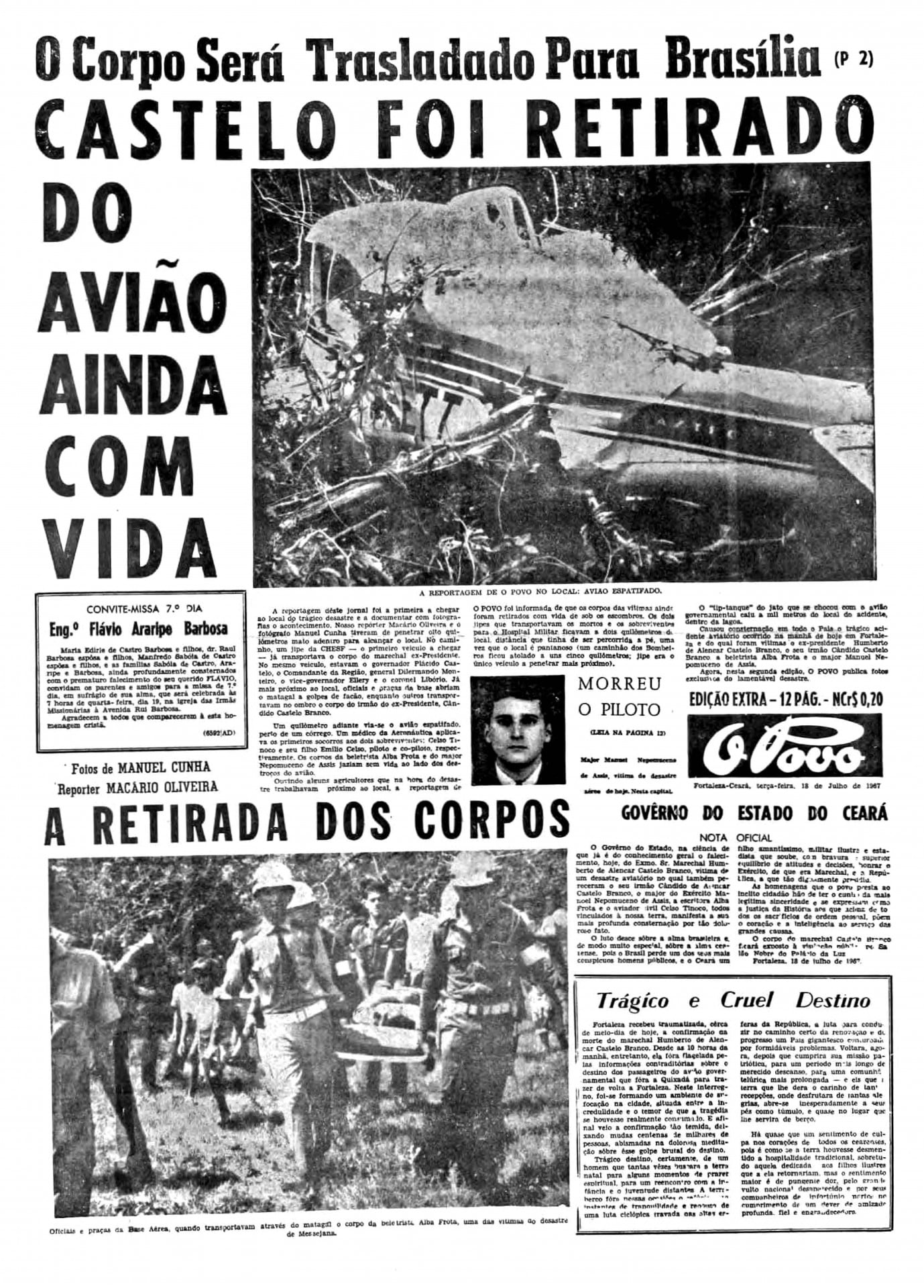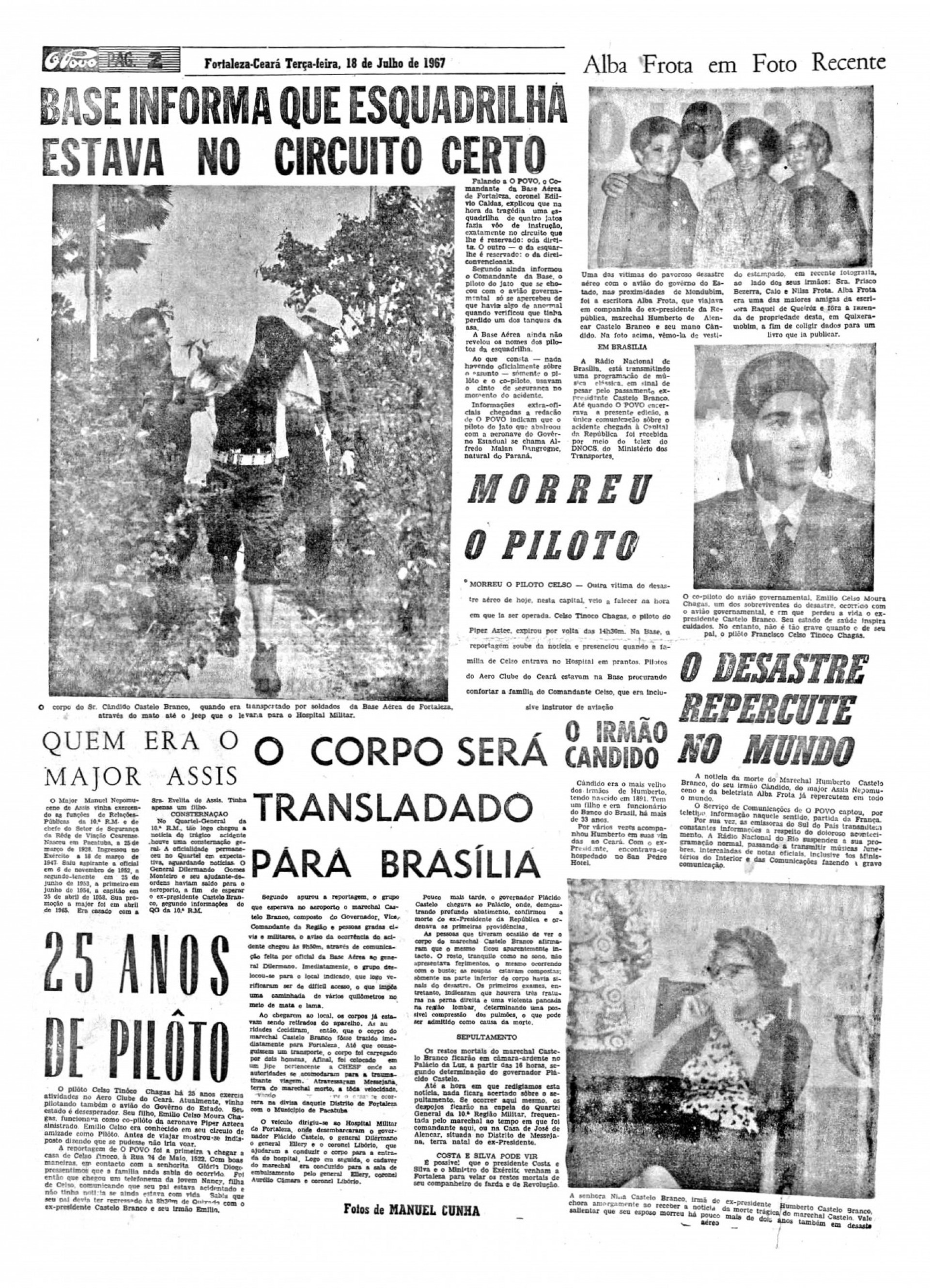 Castello Branco morreu aos 69 anos, em 18 de julho de 1967, na primeira visita ao Ceará após deixar o poder, numa colisão entre aeronaves quando retornava do sítio da amiga Rachel de Queiroz, em Quixadá.