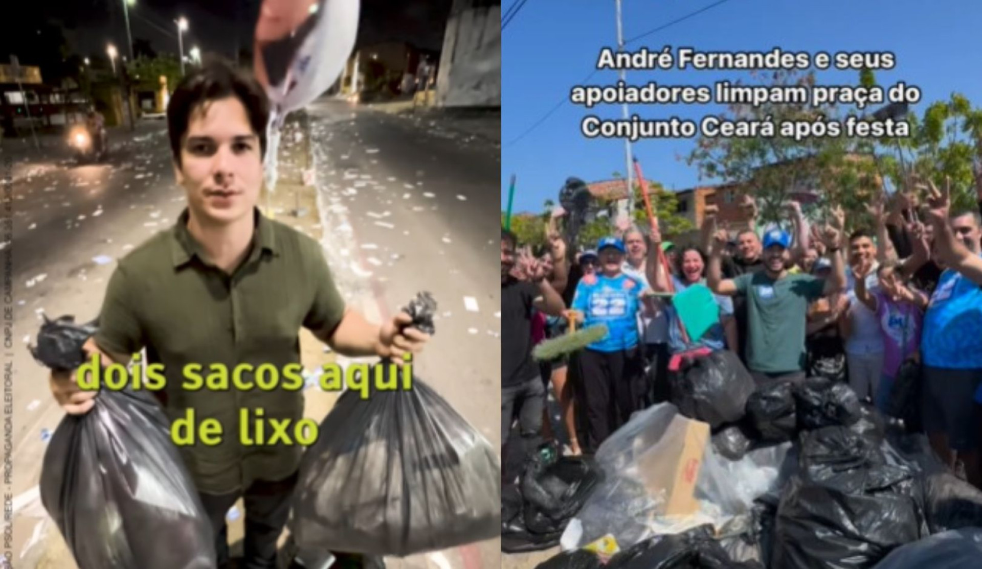 Após ato realizado na noite desse sábado, 21, pelo candidato André Fernandes (PL) com a presença do deputado federal Nikolas Ferreira (PL-MG), o vereador Gabriel Aguiar (Psol) foi às redes sociais denunciar sujeira deixada na Praça da Caixa Econômica, no bairro Conjunto Ceará, em Fortaleza. Na tarde deste domingo, 22, o candidato a prefeito de Fortaleza publicou vídeo limpando o local.