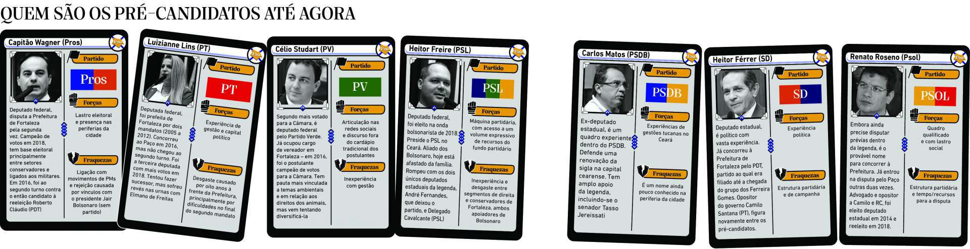 A quatro meses do primeiro turno das eleições municipais, adiadas para 15 de novembro e 29 do mesmo mês, partidos e pré-candidatos ainda traçam planos e estratégias para a disputa. Em Fortaleza, sete concorrentes que se apresentaram até o momento para a sucessão fazem apostas para o pleito.