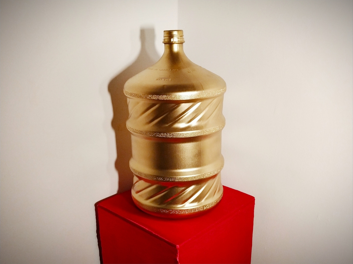 “Ao pintar um garrafão de ouro e colocar num lugar de visibilidade e requinte, quase como um objeto de luxo, eu estou questionando para quem é essa água e de quem é o direito a esse bem comum tão necessário à vida”, provoca Bárbara. A obra compõe um alto pedestal vermelho que guarda um garrafão de água dourado feito ouro. “Costumam falar que a água é o ouro do futuro, mas não sei se fica tão evidente o porquê. A água é um recurso natural muito importante para todas as formas de vida, e é um absurdo que haja uma capitalização tão grande em cima”, conclui.