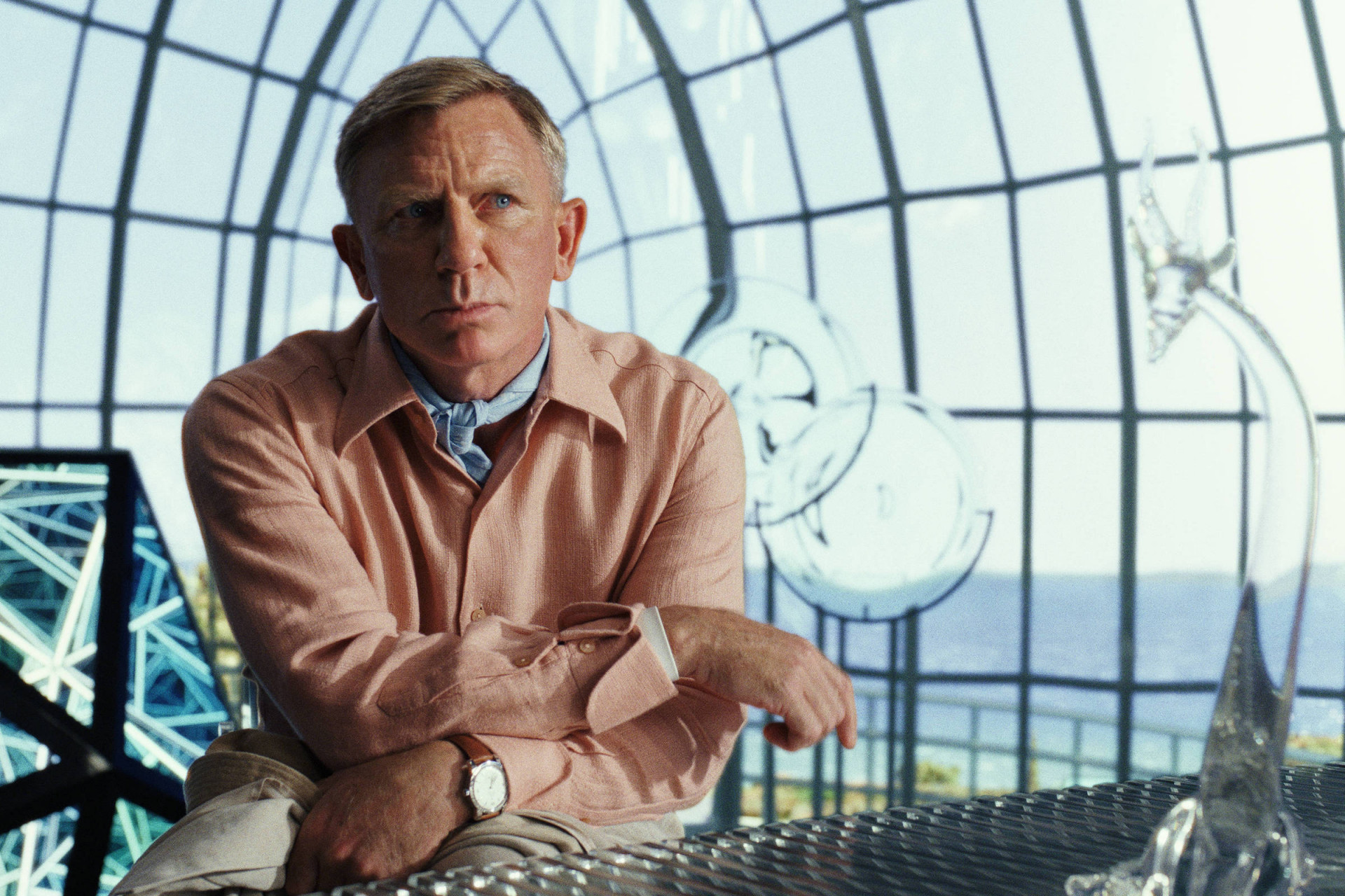 Como é comum em sequências, "Glass Onion" é maior. Sai a mansão na região de New England, no Nordeste dos Estados Unidos, e entra uma ilha grega e uma casa espetacular com uma cebola de vidro no topo. Em vez de uma família, temos agora um grupo de amigos "disruptores" que se reúne anualmente a convite do bilionário Miles Bron (Edward Norton), dono de uma empresa de tecnologia, que agora quer promover uma brincadeira de detetive.