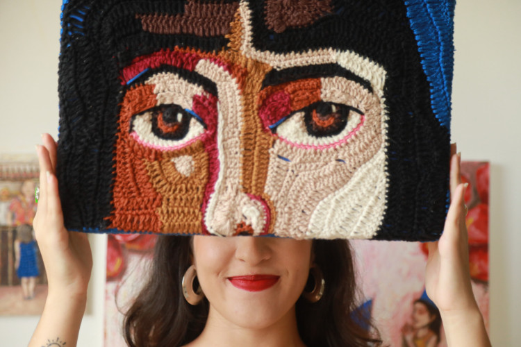 Com leveza e graça, Bia Mourão pinta delicadamente obras que refletem questões do passado, momentos e memórias afetivas que vivia em sua terra natal. A artista é do bairro Salinas, em Fortaleza, e vem ganhando destaque na cena cultural da cidade por seu trabalho com pinturas a óleo e crochê.