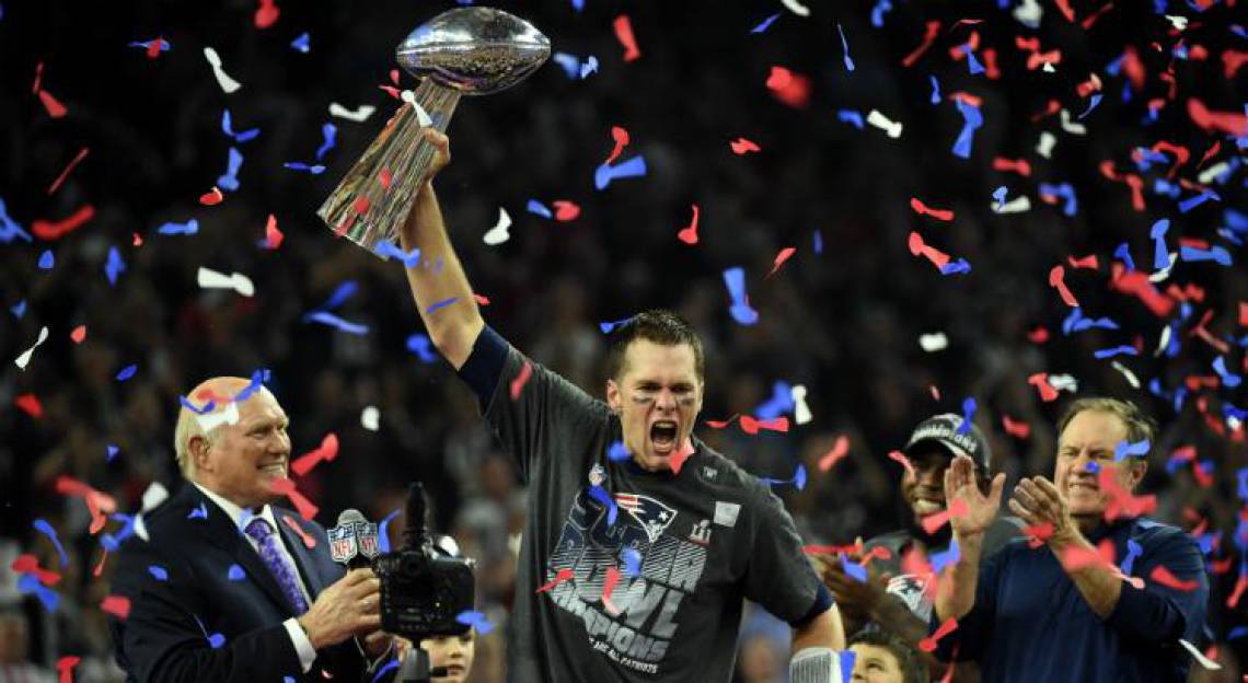Pela frente, tinham o atual campeão, o Seattle Seahawks, e até chegaram a estar dez pontos atrás no placar. Mas Tom Brady liderou o time para uma virada histórica com dois passes para touchdown no último quarto e conquistar o seu quarto Super Bowl e se igualar a seu ídolo de infância, Joe Montana.