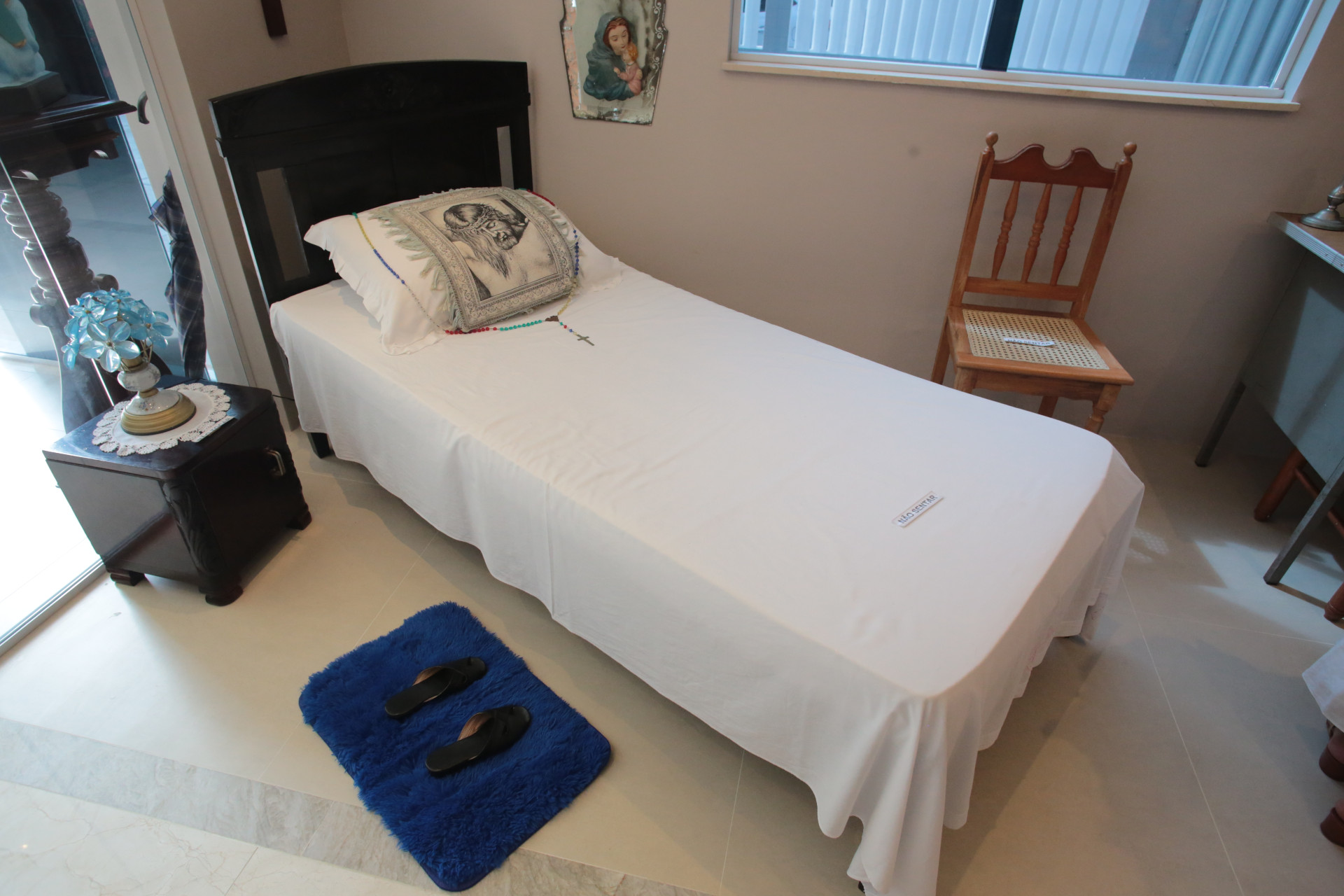 À esquerda da sala, a cama estreita de madeira escura está coberta por um lençol branco onde repousa um rosário. Ao lado, a mesinha de estudos de dona Rosita (1909–1991) expõe alguns dos seus objetos pessoais: porta-canetas, blocos de papel, os óculos. Num armário, os vestidos de corte reto acinturados com bolsos laterais ainda guardam um azul tão novo que parecem à espera da religiosa.