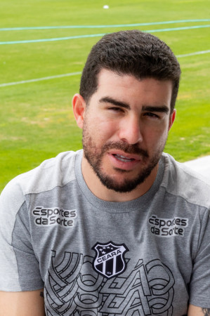 Ao fim da entrevista, o volante precisou se apressar para não perder a sessão de vídeo apresentada pelo técnico Léo Condé antes da estreia do time no Campeonato Cearense, diante do Tirol