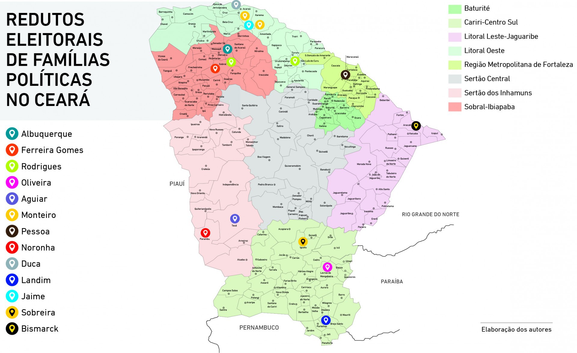 Olhando para o mapa do Ceará acima, é possível identificar grupos familiares com bases eleitorais bem definidas. Em alguns casos, com domínio hegemônico e ampla ramificação em diferentes arenas de poder. É o caso dos Aguiar.